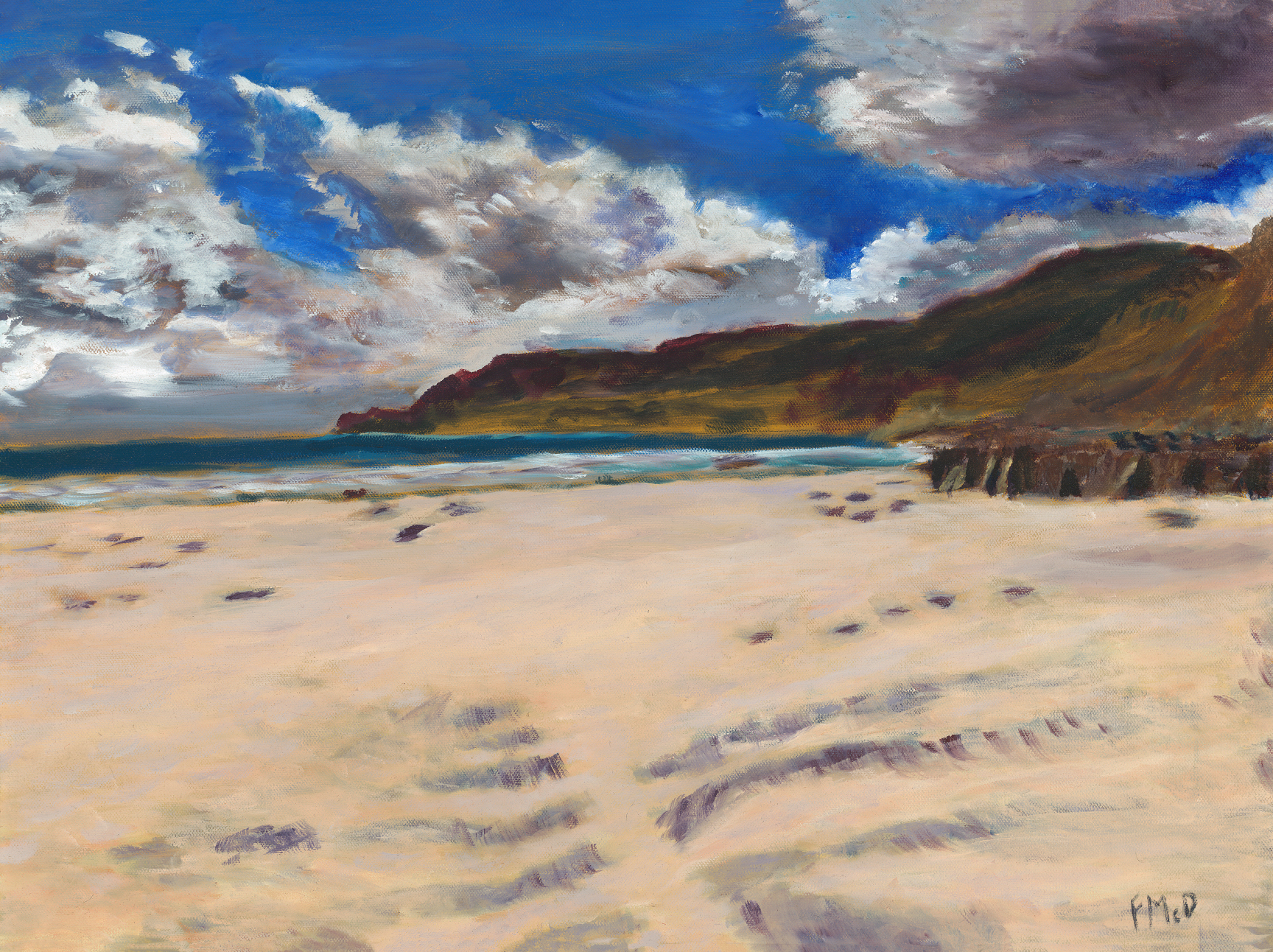 - Fraser has fond childhood memories of driving through Mull to Iona on holiday and was inspired to paint this picture. Calgary Bay is a village on the Isle of Mull on the West Coast of Scotland, with sweeping landscapes and gorgeous beaches, some of which are hidden from immediate view. This painting’s dramatic sky highlights the shoreline below.