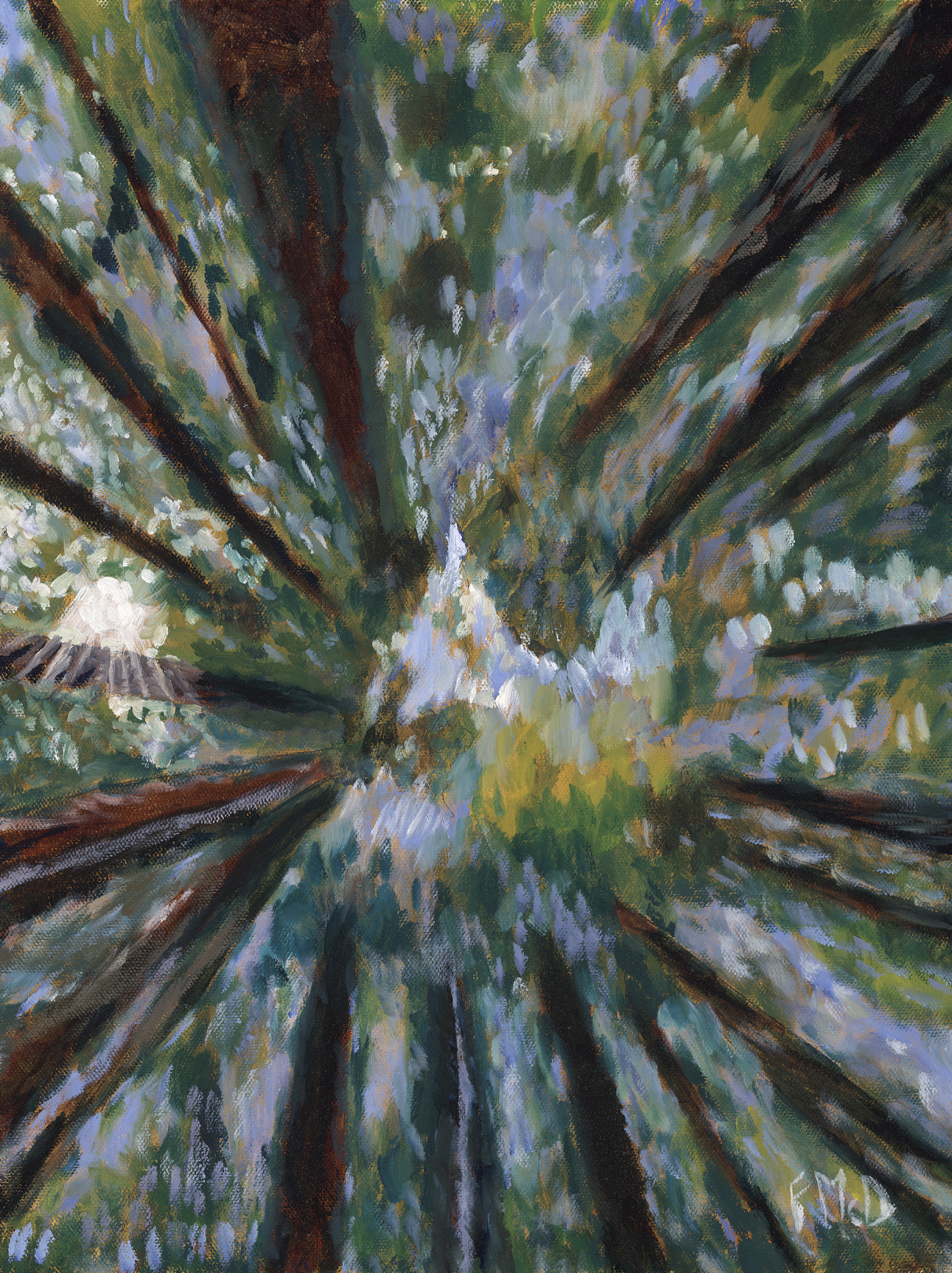 - John Muir was born in Dunbar, Scotland, before coming to the United States and advocating for the preservation of wild spaces in the world. Fraser painted a scene from Muir Woods in California, looking up through magnificent redwood trees to the sky. The abstract style of the painting interprets the light penetrating the canopy as stars.