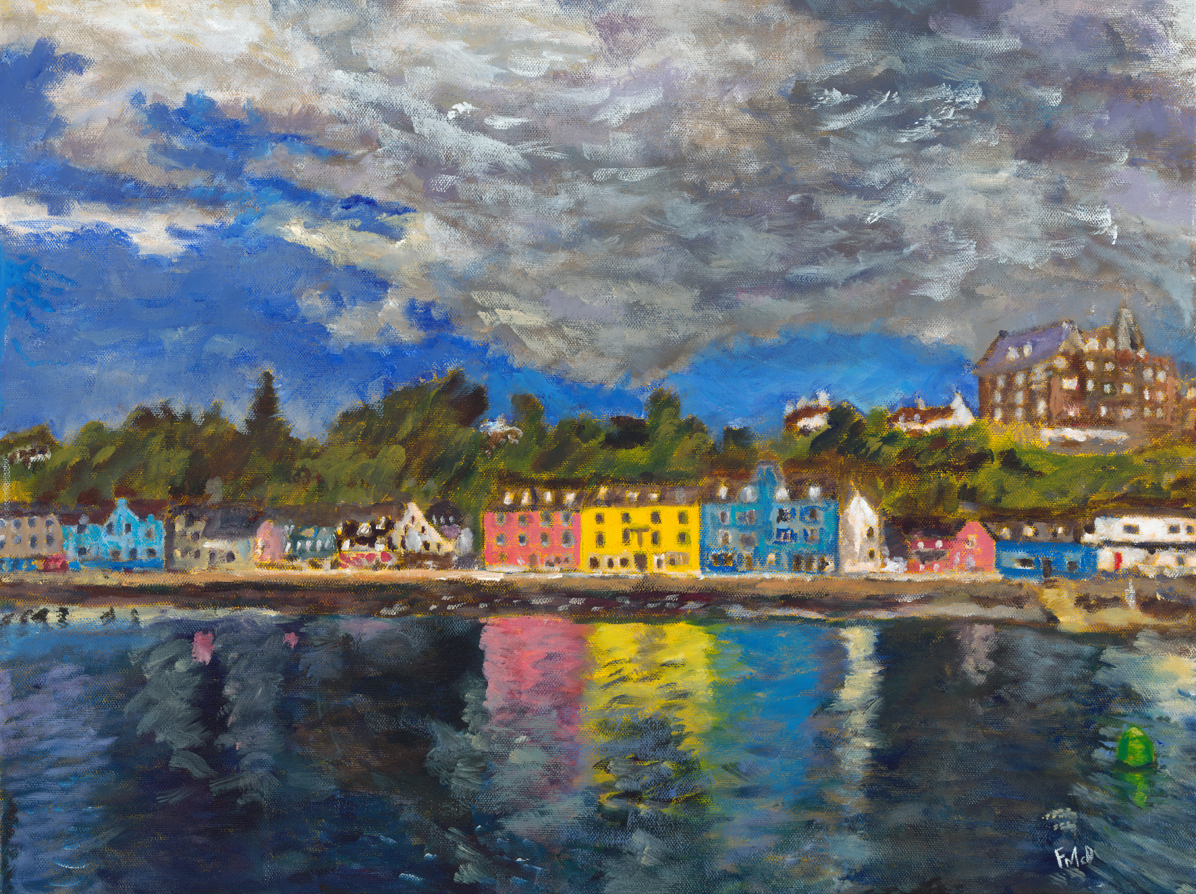 Tobermory is the capital of the Isle of Mull in the Scottish Inner Hebrides. As with many coastal towns, people lived there for over a thousand years before it was founded as a fishing port, and in the 18th century the layout was designed by the famous engineer Thomas Telford. He was so prolific as engineer of road and canal projects, that during his lifetime he was dubbed the ‘Colossus of Roads’. Fraser latterly worked in Scotland in a similar fishing port, and was drawn to painting a location where the beauty of the environment juxtaposed with the harshness of working conditions for many fishermen. Fraser also studied at a community college named after the great Thomas Telford and was trained as a fishmonger when he left school.